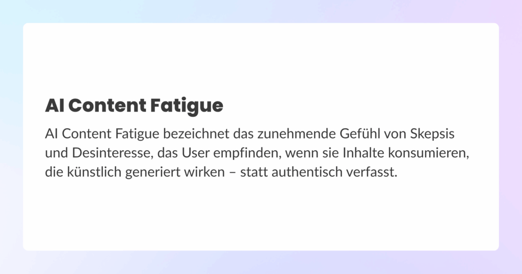 KI-Content-Fatigue beschreibt die wachsende Skepsis, die Nutzer beim Konsum von Inhalten entwickeln, die sich generiert anfühlen — nicht wirklich verfasst. Es geht dabei nicht nur um technische Qualität, sondern um Authentizitätssignale.