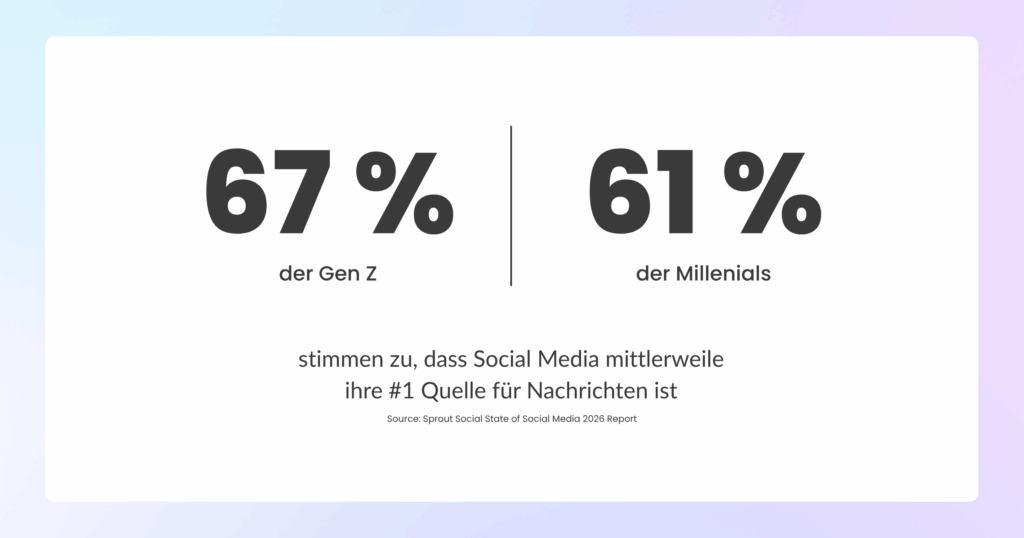 Der Sprout Social Q1 2026 Pulse Survey unter 2.000+ Nutzern in den USA, UK und Australien ergab: Social Media hat TV als #1-Nachrichtenquelle überholt (Gen Z: 67 %, Millennials: 61 %), 88 % der Nutzer sagen, KI-generierter Content hat ihr Vertrauen in Social-Media-News geschwächt, und Fehlinformationen (30 %) sowie unkontrollierte KI-Inhalte (20 %) sind die führenden Vertrauenskiller auf Social-Plattformen. Das allgemeine Plattformvertrauen bleibt relativ stabil, aber das Vertrauen in KI-generierten Content speziell ist niedrig und rückläufig.